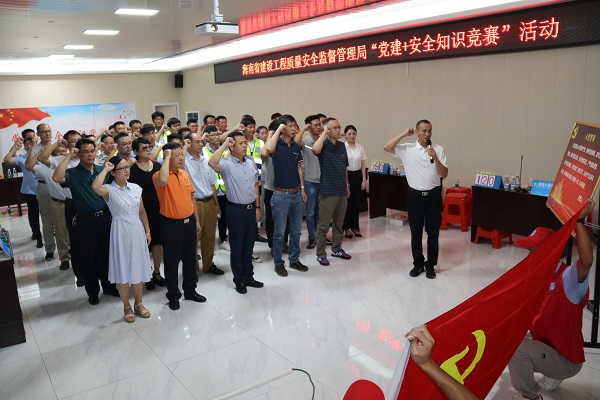 為推進(jìn)基層黨組織聯(lián)建共建,深入開展全國“安全生產(chǎn)月”活動,落實(shí)公司關(guān)于安全生產(chǎn)工作的要求,牢固樹立安全發(fā)展理念,七一前夕,海南萬泰公司組織隊(duì)伍參加了由海南省建設(shè)工程質(zhì)量安全監(jiān)督管理局舉辦的“黨建+安全知識競賽”活動,省廳張運(yùn)臻處長,省質(zhì)安局陳雷書記、劉長征副局長等有關(guān)領(lǐng)導(dǎo)參加活動。