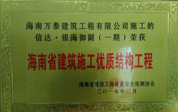 2017年6月20日,經過了長期的嚴格評審之后,由海南萬泰承建的海口市人民醫(yī)院綜合保障樓、瓊海信達銀海御湖(一期)、銘德.美景苑三個項目全部通過基礎、主體階段的評審,并榮獲海南省建設工程質量安全檢測協(xié)會頒發(fā)的《海南省建筑施工優(yōu)質結構工程》證書。至此,繼“藍城商務大廈 ”榮獲“椰城杯”后,萬泰工程再斬殊榮。值得一提的是,這已經是萬泰本年度第三次榮獲相關獎項。
