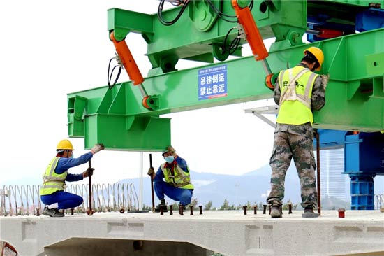 據(jù)介紹,預(yù)制構(gòu)件在中交二航局中山預(yù)制廠集中預(yù)制,經(jīng)過171公里船舶海運(yùn)和3公里陸運(yùn)至施工現(xiàn)場(chǎng),采用中交二航局自主研發(fā)的TP120預(yù)制裝配式一體化架橋機(jī)進(jìn)行裝配施工。該架橋機(jī)具有施工過程占地面積小、對(duì)沿線地面運(yùn)輸條件要求低、操作平臺(tái)和調(diào)位系統(tǒng)精確可靠,以及上下部構(gòu)件可同時(shí)安裝連接等優(yōu)勢(shì),特別適用于城市交通繁忙地區(qū)的市政橋梁工程建設(shè)。