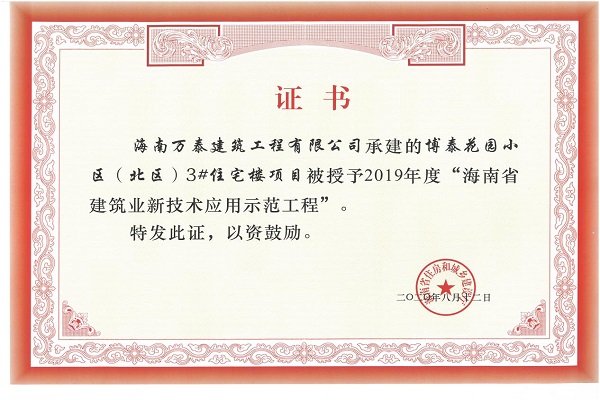 近日,從海南省住房和城鄉(xiāng)建設(shè)廳傳來喜訊,由海南萬泰建筑工程有限公司承建的“博泰花園小區(qū)(北區(qū))3#住宅樓項目”和“聯(lián)合產(chǎn)權(quán)酒店項目”榮獲2019年度“海南省建筑業(yè)新技術(shù)應(yīng)用示范工程”。