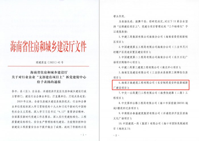 陽春三月春意濃,牛年大吉開門紅!喜慶春節(jié)剛過,迎來十四五開局,恰逢全國“兩會(huì)”勝利召開之際,海南萬泰建筑工程有限公司長安制藥美安科技新城新廠建設(shè)項(xiàng)目榮獲海南省住房和城鄉(xiāng)建設(shè)廳對(duì)“支部建在項(xiàng)目上”抓黨建促中心工作通報(bào)表揚(yáng),全省共11家企業(yè)獲得此殊榮,海南萬泰為獲表彰的民企之一。