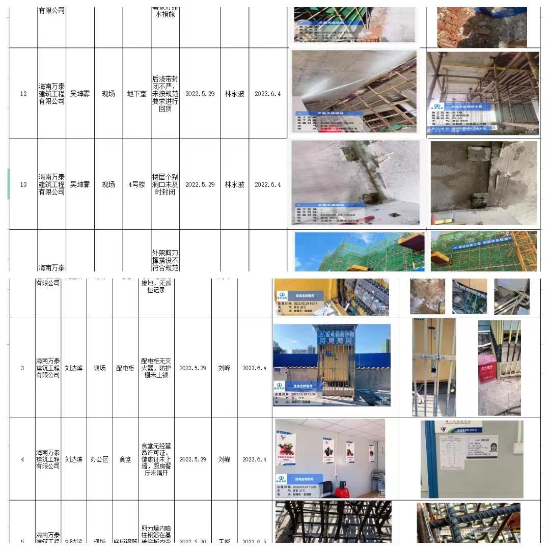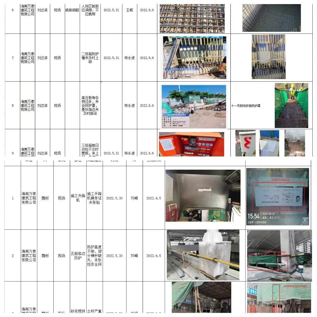 為落實(shí)海南省住建廳關(guān)于《海南省房屋市政工程安全生產(chǎn)治理行動(dòng)實(shí)施方案》以及“黨建引領(lǐng)促發(fā)展”2022年“安全生產(chǎn)月”活動(dòng)暨項(xiàng)目標(biāo)準(zhǔn)管理宣貫大會(huì)的有關(guān)要求,進(jìn)一步推動(dòng)項(xiàng)目安全生產(chǎn)工作做深做實(shí),履行安全生產(chǎn)監(jiān)管職責(zé),樹立安全生產(chǎn)發(fā)展理念,結(jié)合全國安全生產(chǎn)月活動(dòng),2022年5月20日至6月8日,海南萬泰公司開展2022年“安全生產(chǎn)月”各項(xiàng)目安全生產(chǎn)治理行動(dòng)。本次檢查小組由公司工程部人員組成,分別對(duì)海南省政務(wù)服務(wù)中心二期項(xiàng)目、海南省第三人民醫(yī)院項(xiàng)目、化藥生產(chǎn)及研發(fā)基地(二期)項(xiàng)目、佳元?七彩瀾灣南區(qū)商業(yè)、四季康城?水岸城邦、三亞國際傳媒中心項(xiàng)目二期等省內(nèi)26余個(gè)在建項(xiàng)目進(jìn)行系統(tǒng)、全面、徹底的檢查。