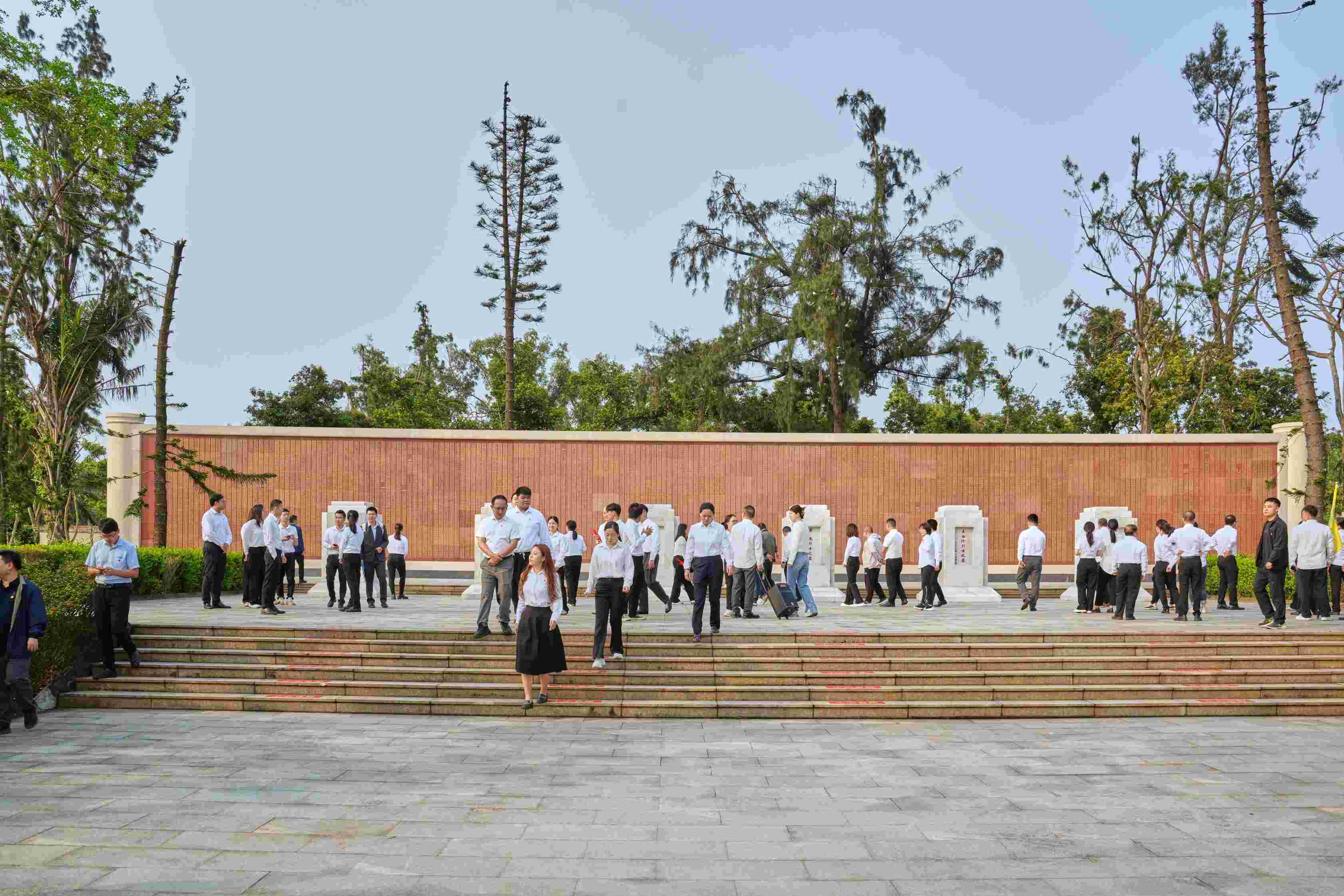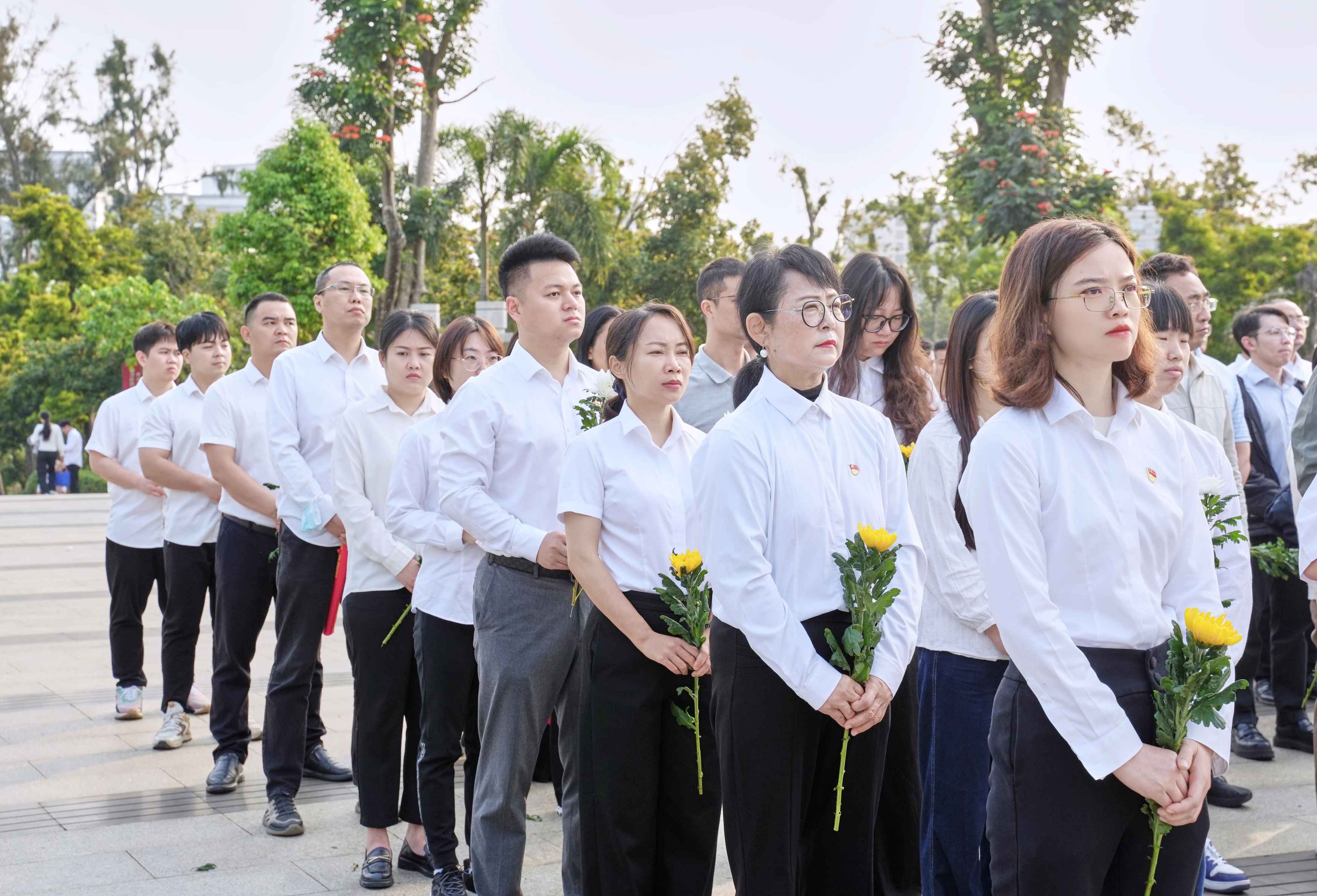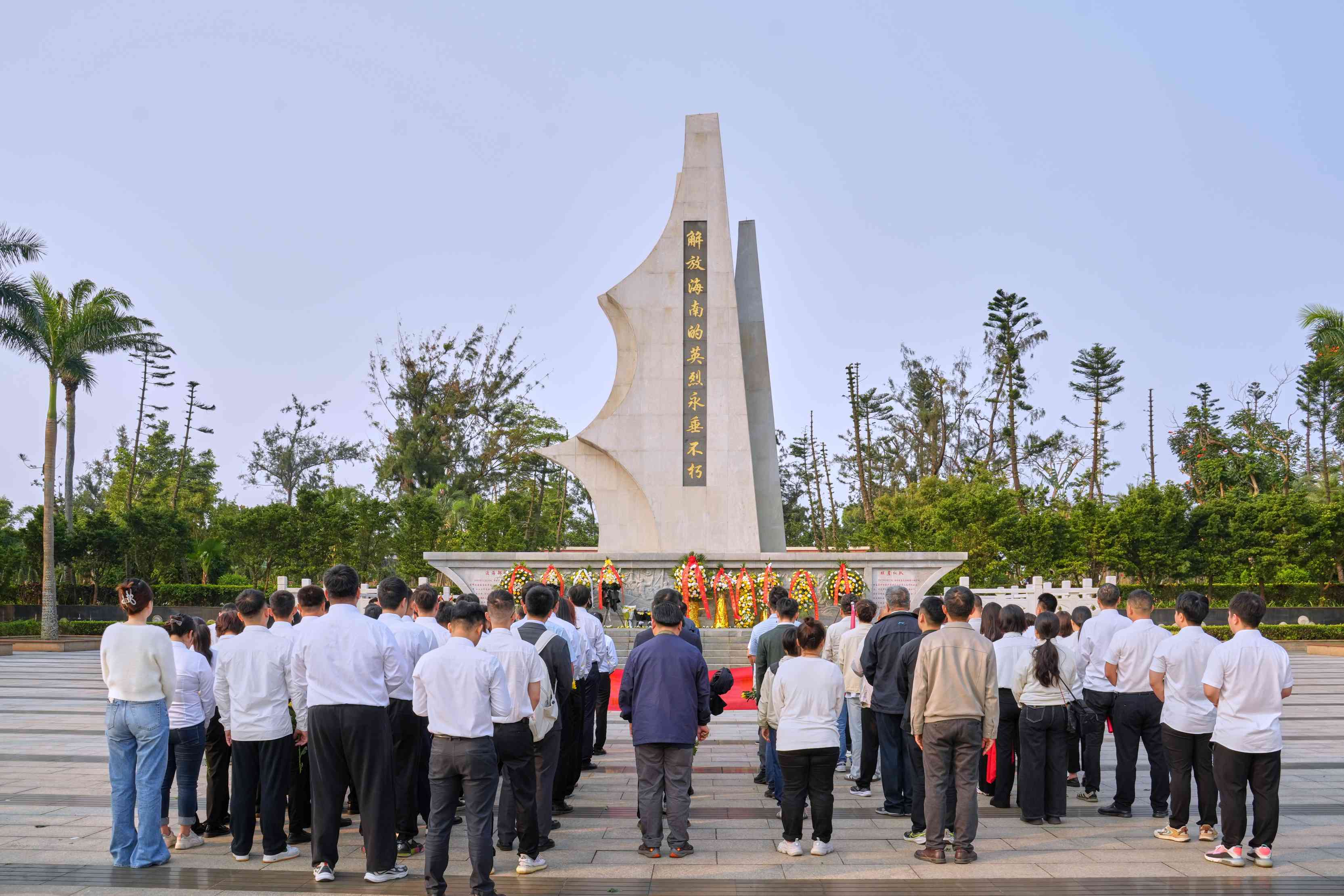 上午8時,來自省住建廳相關處室以及建筑行業(yè)相關基層黨組織,共90余名黨員、入黨積極分子齊聚??谑薪夥藕D蠉u戰(zhàn)役烈士陵園。大家身著統(tǒng)一淺色上衣、深色下裝,佩戴黨徽,整齊列隊,在莊嚴肅穆的烈士紀念碑前肅立。