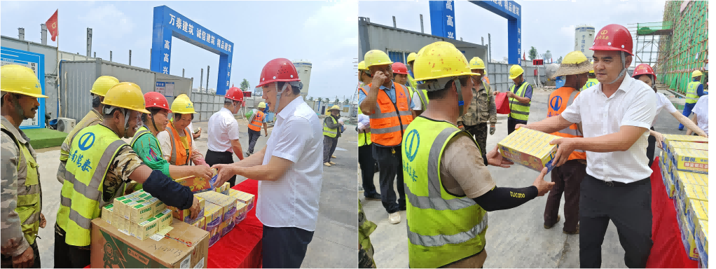 在活動中,顏利首選了解了項目的建設(shè)情況以及工人作業(yè)安全保障工作,叮囑工友們要注意提高防范意識,勞逸結(jié)合,做好夏日防暑工作,保護(hù)好自身安全,以更飽滿的熱情和昂揚的斗志,投入到工作中去,為項目早日竣工貢獻(xiàn)力量。隨后,大家共同為工友們送去了下火茶、綠豆、消暑藥品等清涼物資以及節(jié)日祝福。