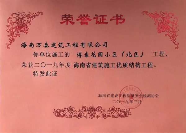 博泰花園小區(qū)(北區(qū))“海南省建筑施工優(yōu)質(zhì)結(jié)構(gòu)”獎