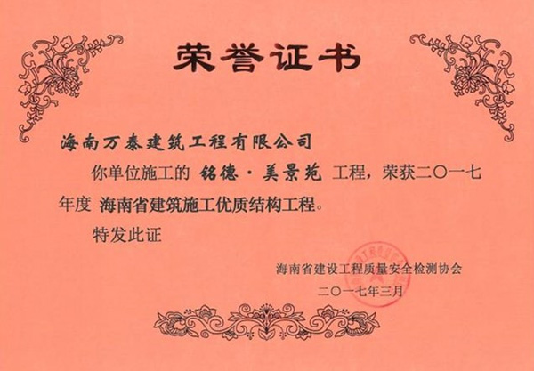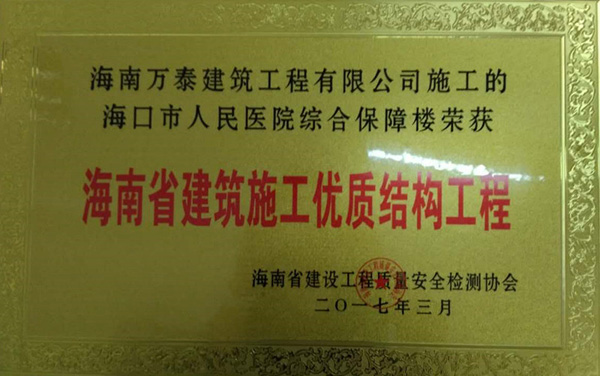 2017年6月20日,經過了長期的嚴格評審之后,由海南萬泰承建的海口市人民醫(yī)院綜合保障樓、瓊海信達銀海御湖(一期)、銘德.美景苑三個項目全部通過基礎、主體階段的評審,并榮獲海南省建設工程質量安全檢測協(xié)會頒發(fā)的《海南省建筑施工優(yōu)質結構工程》證書。至此,繼“藍城商務大廈 ”榮獲“椰城杯”后,萬泰工程再斬殊榮。值得一提的是,這已經是萬泰本年度第三次榮獲相關獎項。