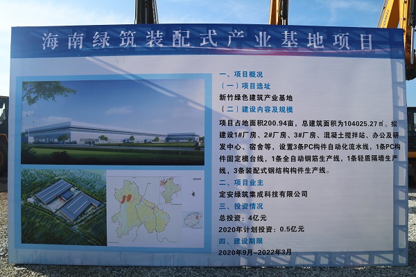 此次開工建設(shè)的海南綠筑裝配式產(chǎn)業(yè)基地項目,選址定安縣新竹綠色建筑產(chǎn)業(yè)基地,位于海南中線高速高路新竹出入口東側(cè)、省道云文線北側(cè),在交通便利上有著無可比擬的優(yōu)勢。項目總占地面積200.94畝,總建筑面積104025.27㎡,總投資4億元,擬建設(shè)1#廠房、2#廠房、3#廠房、混凝土攪拌站、辦公及研發(fā)中心、宿舍等,設(shè)置3條PC構(gòu)件自動化流水線,1條PC構(gòu)件固定模臺線,1條全自動鋼筋生產(chǎn)線,1條輕質(zhì)隔墻生產(chǎn)線,3條裝配式鋼結(jié)構(gòu)構(gòu)件生產(chǎn)線,2020年計劃投資0.5億元。項目建成后將大大提升定安縣新竹綠色建筑產(chǎn)業(yè)發(fā)展的規(guī)模效應(yīng)和產(chǎn)業(yè)集聚效應(yīng),逐步建成具有一定規(guī)模的綠色建筑產(chǎn)業(yè)基地。