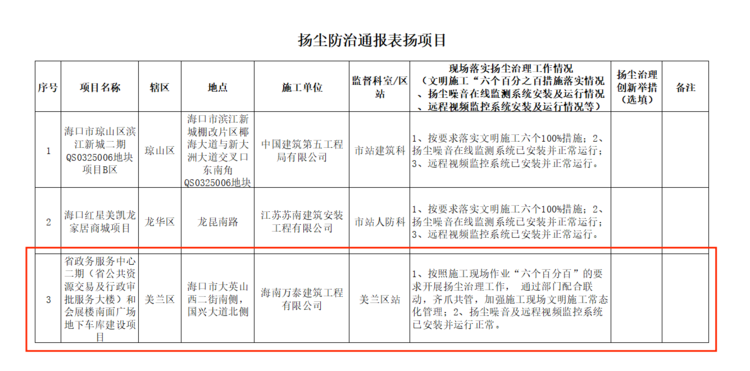 根據(jù)《2021年大氣治理沖刺階段管控措施清單》,??谑凶〗ň謱κ鼙O(jiān)在建項目工地進行打分考核,列出第一批紅黑榜,對在揚塵防治方面表現(xiàn)突出的前3名受監(jiān)在建項目工地記入??谑薪ㄖさ負P塵治理“紅榜”,對排名在后5名的受監(jiān)在建項目工地記入??谑薪ㄖさ負P塵治理“黑榜”。海南萬泰承建的省政務中心二期(省公共資源交易及行政審批服務大樓)和會展樓南面廣場地下車庫建設項目因按照施工現(xiàn)場作業(yè)“六個百分百”的要求開展揚塵治理工作,通過部門配合聯(lián)動,齊抓共管,加強施工現(xiàn)場文明施工常態(tài)化管理,且揚塵噪音及遠程視頻監(jiān)控系統(tǒng)均以安裝并運行正常等,榮登海口市建筑工地揚塵治理“紅榜”。