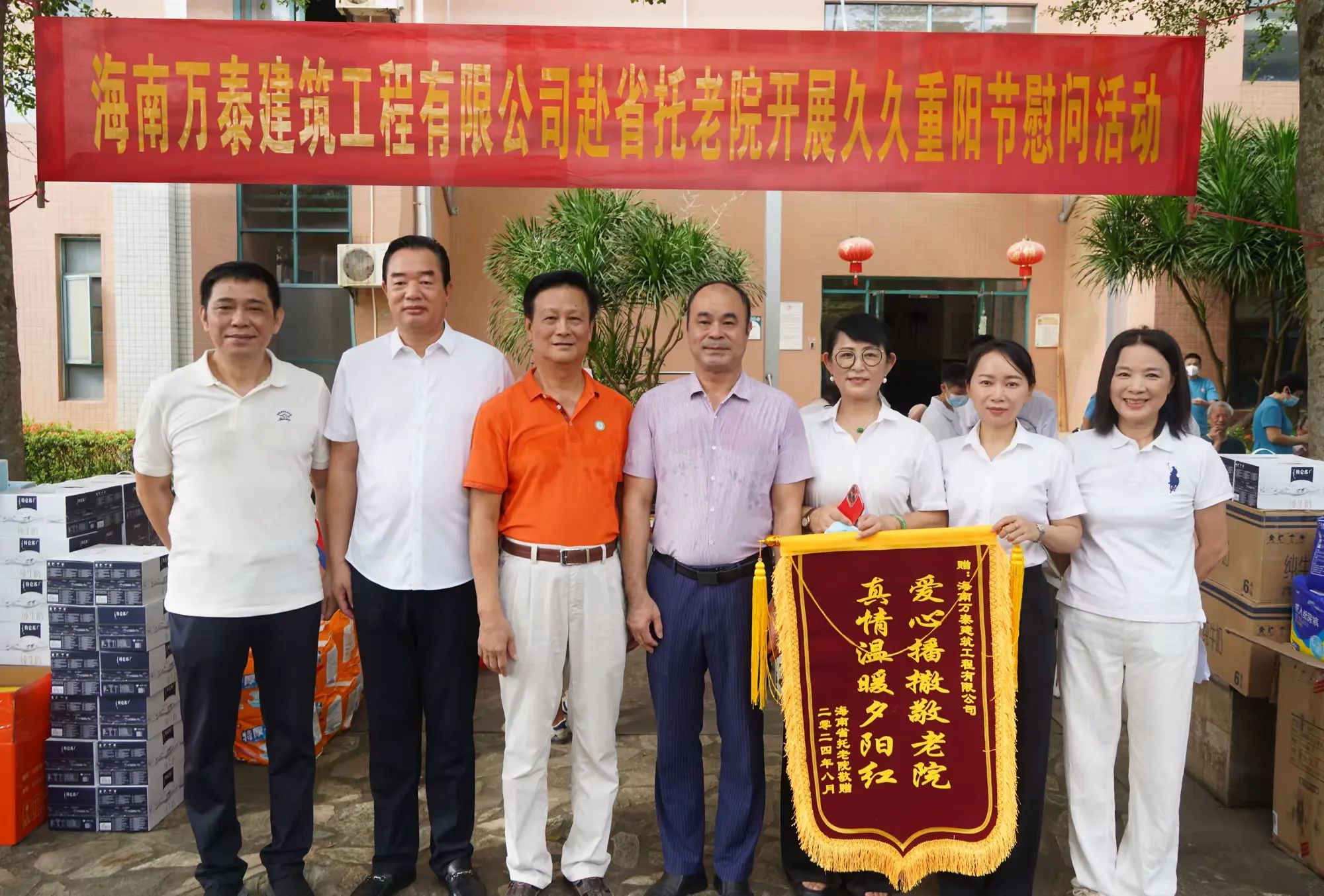 8月19日,為進一步發(fā)揚企業(yè)愛心之舉,傳播敬老愛老養(yǎng)老的優(yōu)秀傳統(tǒng)文化精神,在中秋、重陽節(jié)即將到來之際,海南萬泰建筑工程有限公司參加了由??谑旋埲A區(qū)關工委、龍華區(qū)金貿(mào)街道商會、海南愛心企家團隊聯(lián)合舉辦的慰問活動。公司總經(jīng)理顏利及黨支部、工會有關人員參加本次活動。