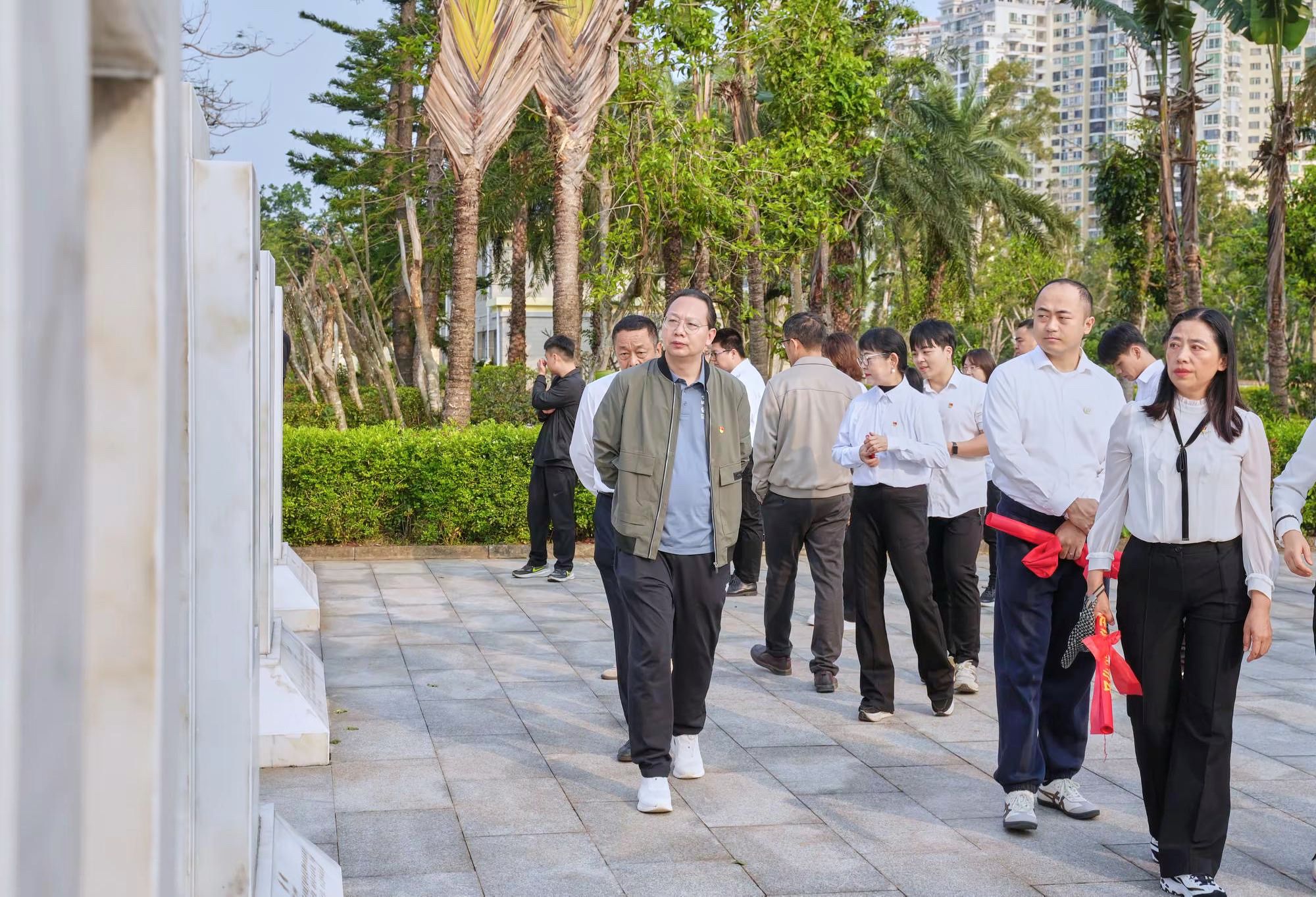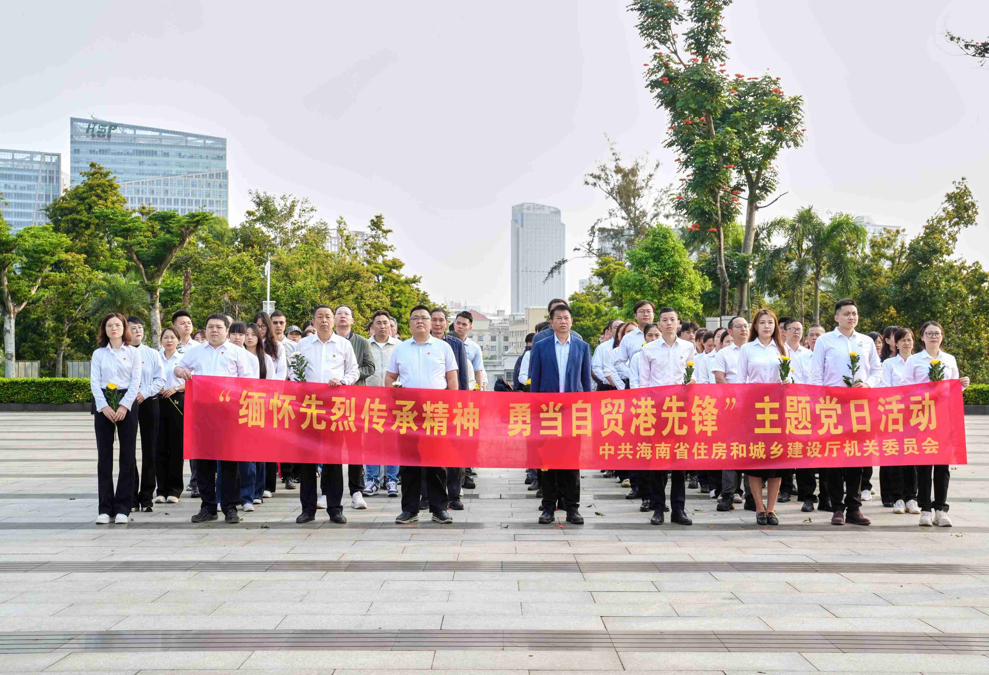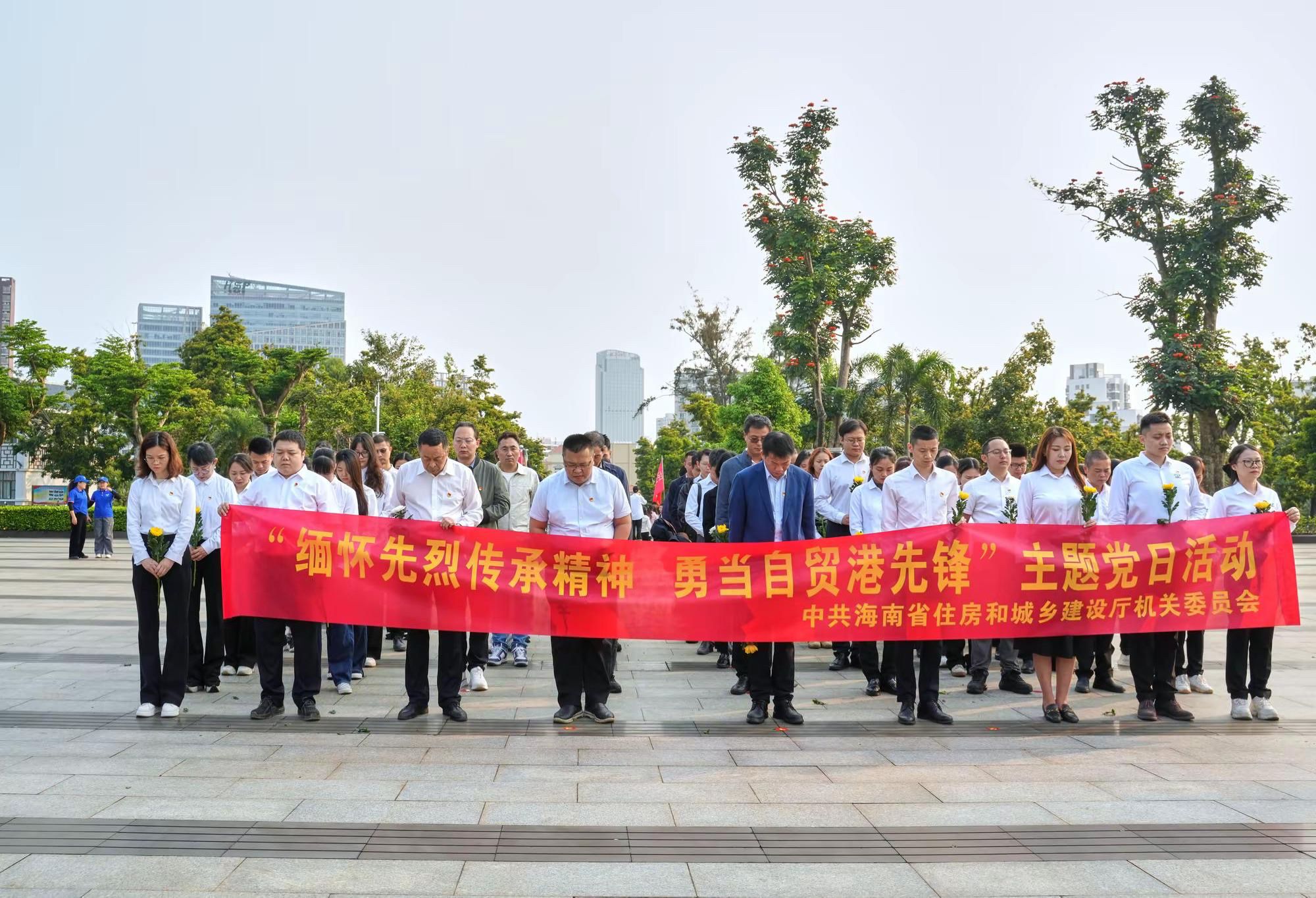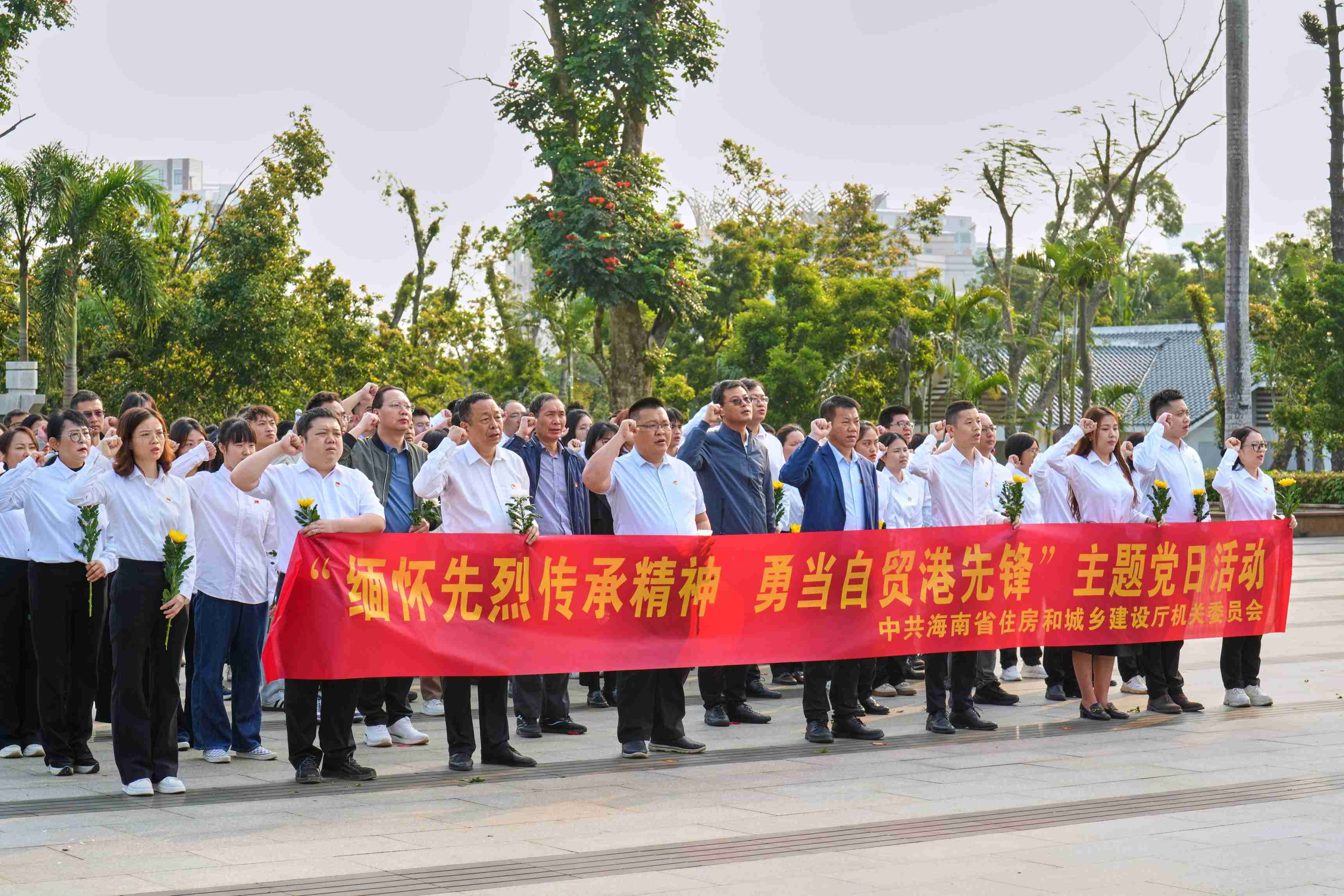 上午8時,來自省住建廳相關處室以及建筑行業(yè)相關基層黨組織,共90余名黨員、入黨積極分子齊聚??谑薪夥藕D蠉u戰(zhàn)役烈士陵園。大家身著統(tǒng)一淺色上衣、深色下裝,佩戴黨徽,整齊列隊,在莊嚴肅穆的烈士紀念碑前肅立。