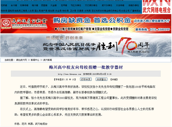 梅川高中校友張小龍向母校捐贈(zèng)一批教學(xué)器材